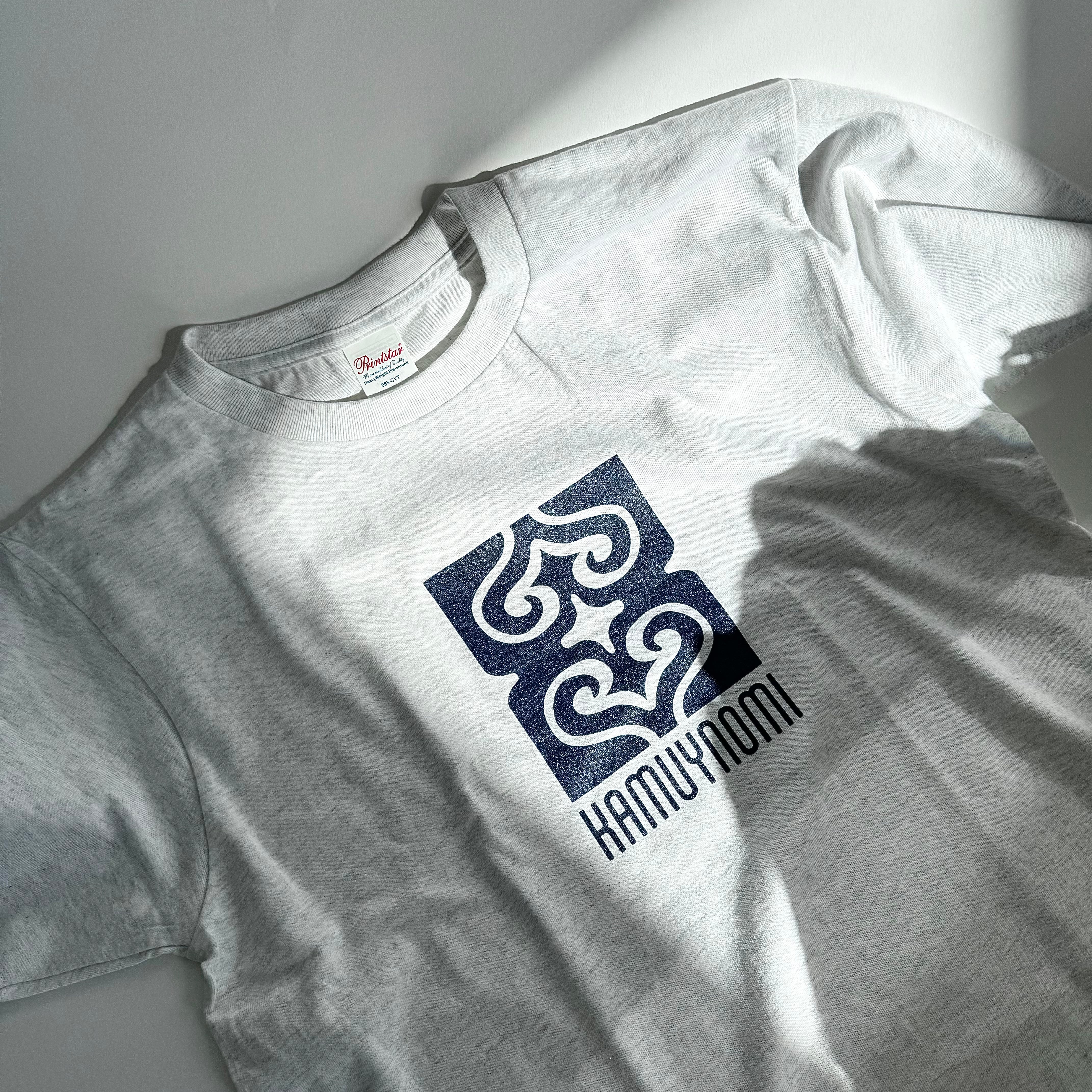 【アッシュグレー×ネイビー】KAMUYNOMIブランドロゴ アイヌ紋様Tシャツ